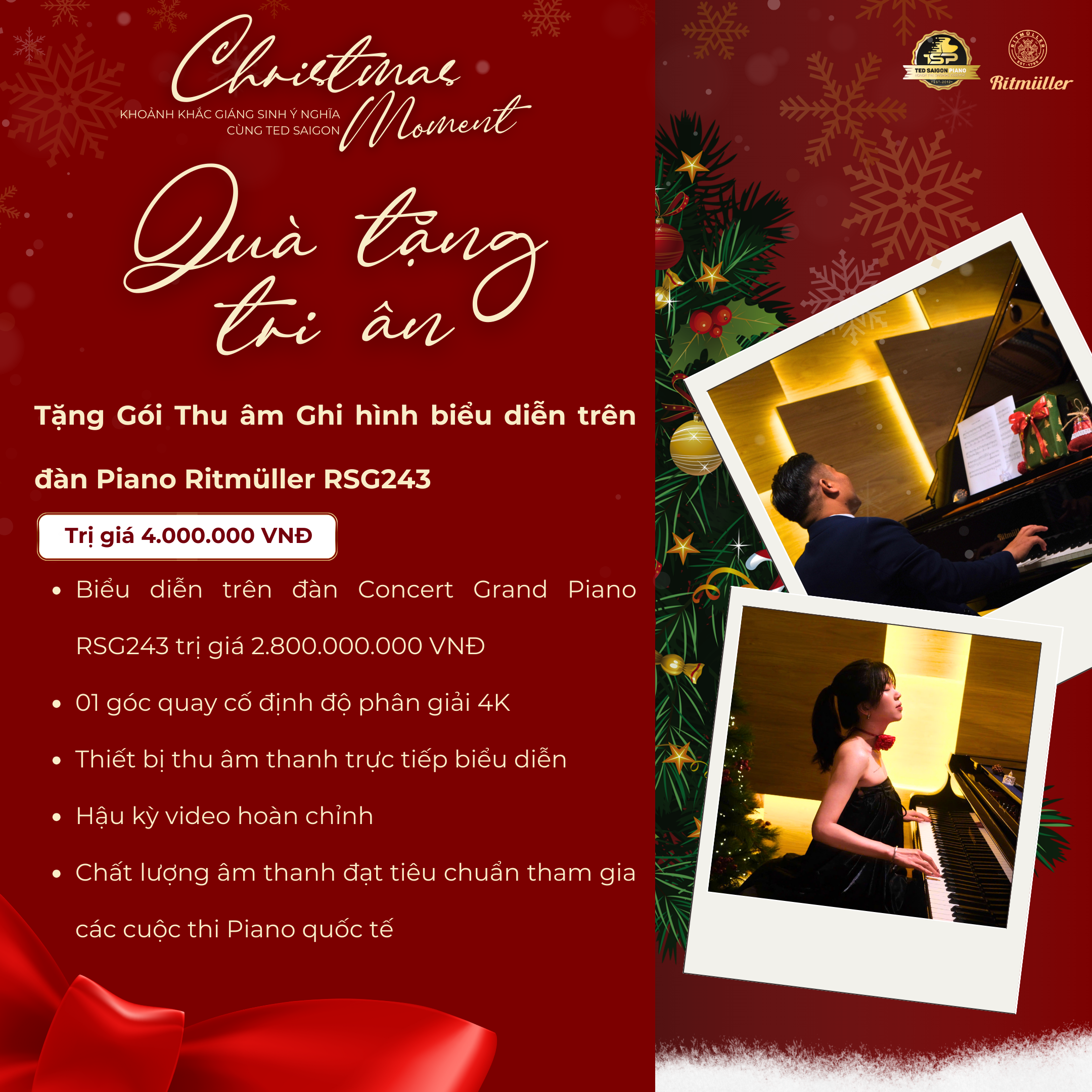 ✓Tặng Gói Thu âm Ghi hình biểu diễn trên đàn Piano Ritmüller RSG243 – 45 phút – Trị giá 4.000.000 VNĐ